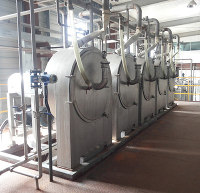 破碎后的薯類或小麥淀粉漿料通過進料機構均勻進入高速旋轉的篩藍內錐面上,在重力及離心力的作用下,漿料沿著篩面作圓周運動并同時向篩藍邊沿移動,通過洗水系統的噴淋,細小的淀粉顆粒透過篩網排出,由篩下消沫泵排出,較大的淀粉顆粒逐漸下落入渣倉并由渣泵排走,進入下離心篩再次分離,除去渣漿中吸附的游離淀粉。在背部系統的反沖洗作用下,可有效地去處篩面吸附的細渣,避免了篩面的堵塞,保證了設備的正常運轉。