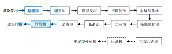 漿染廢水色度高、COD高,特別是根據國外市場開發出來的絲光藍、絲光黑、特深藍、特深黑等印染工藝,該類印染大量使用硫化染料、印染助劑硫化鈉等,因此廢水中含有大量的硫化物,該類廢水加藥預處理,然后再進行系列化處理,才能穩定達標排放。漂染廢水中含有染料、漿料、表面活性劑等助劑,該類廢水水量大,濃度和色度均較低,如果單純采用物化處理,則出水也在100~200mg/l之間,色度也能以滿足排放要求,但污染量大大增加,污泥處理的費用較高,容易造成二次污染,在環保要求較嚴的情況下應充分考慮生化處理系統,常規的強化生物處理工藝可以滿足處理要求。